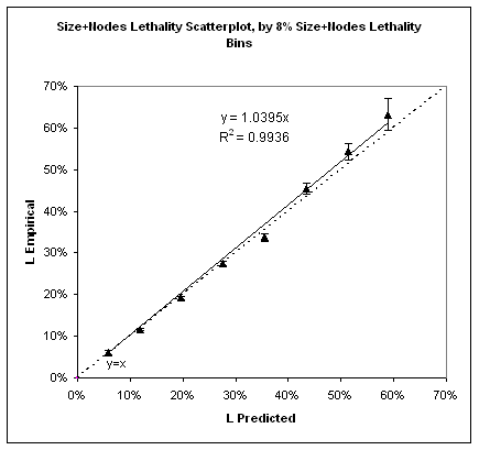 | Risk of breast carcinoma death = | ~1% per mm | + | ~6% per node |